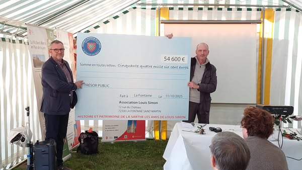 Le 11 octobre 2025, notre président, Martial Simonnet de Kermarec, a remis à Christophe Libert, maire de La Fontaine-Saint-Martin, un chèque symbolique de 54600 €. Ce montant, produit de la vente de la maison de Louis Simon, est un don de notre association destiné à participer à la rénovation de l’église Saint-Martin. La fin des travaux est prévue en 2027.