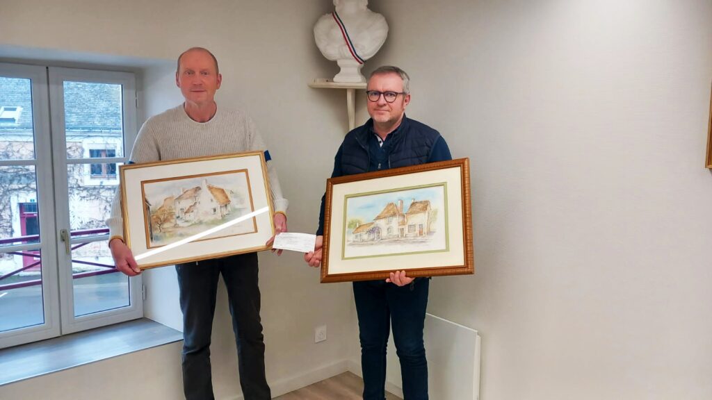 Le 19 décembre 2025, notre président Martial Simonnet de Kermarec a remis au maire de La Fontaine-Saint-Martin le chèque bancaire de 54 600€ pour participer à la rénovation de l’église. Il a aussi fait don de deux aquarelles pour décorer la grande salle de la mairie. Cet événement a donné lieu à la publication de deux articles de presse dans le Maine Libre et Ouest-France.